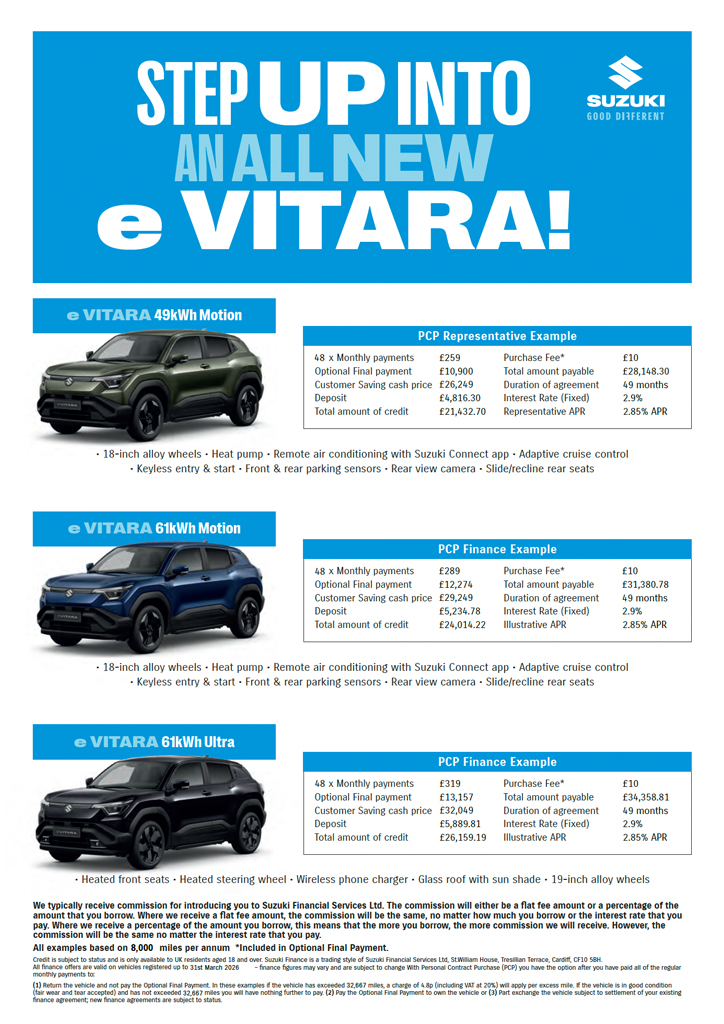 Suzuki financial service representative examples are based on Hire Purchase finance example, HP & PCP Quotes available upon request.